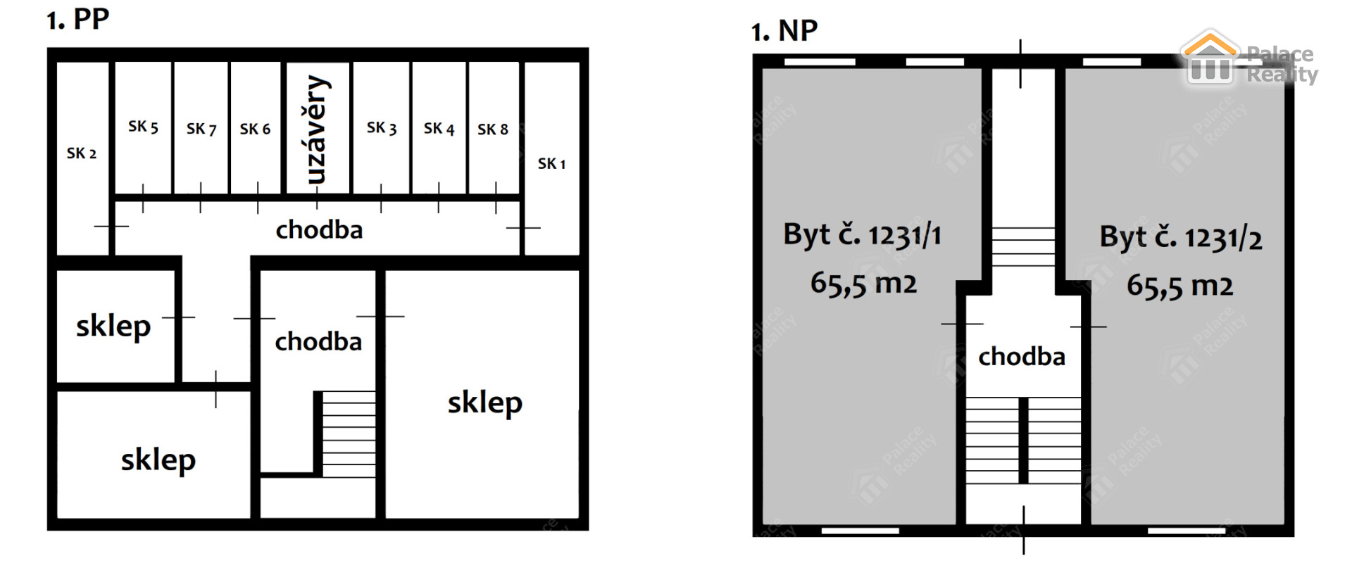 Původní dispozice 2+1 byla upravena praktickou a účelovou rekonstrukcí na dva menší byty - garsoniéru a 1+1 se samostatnými (podružnými) měřidly. Díky vysokým stropům se dále nabízí unikátní možnost využít tento prostor k rozšíření obytné plochy o zvýšené spaní.