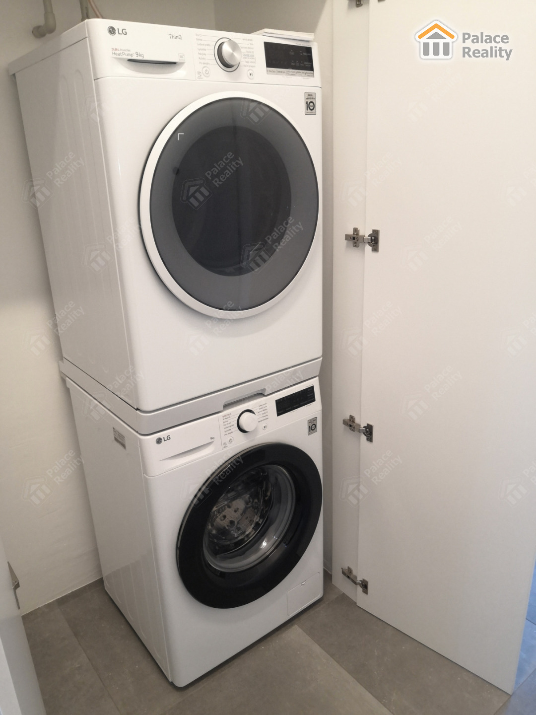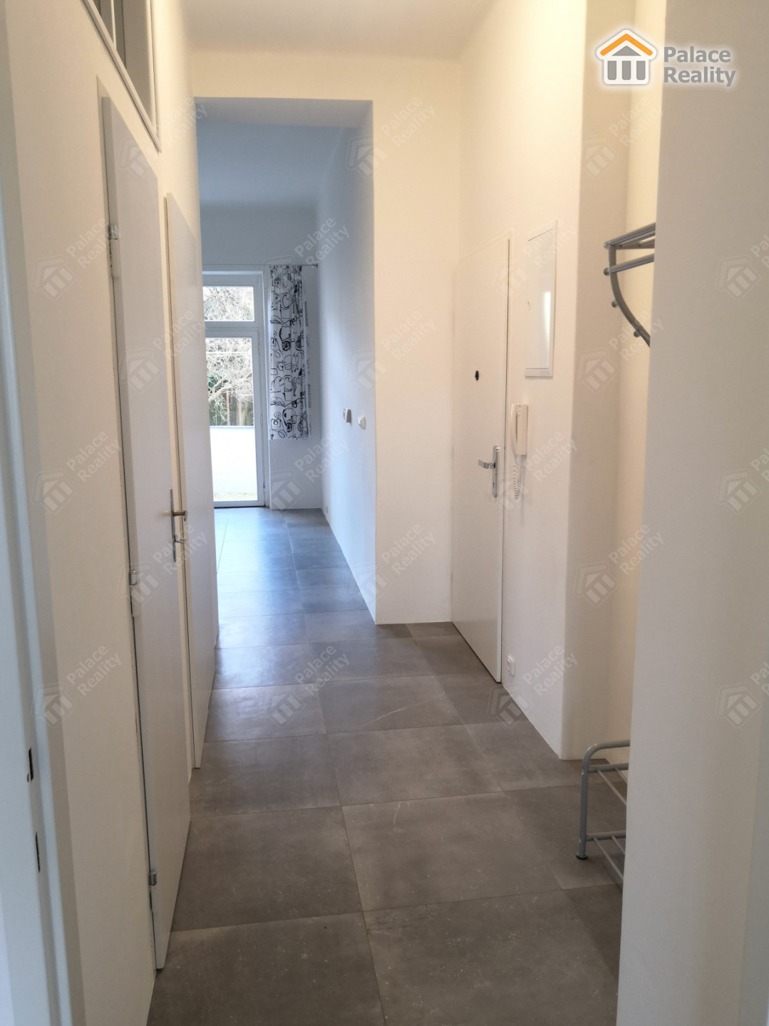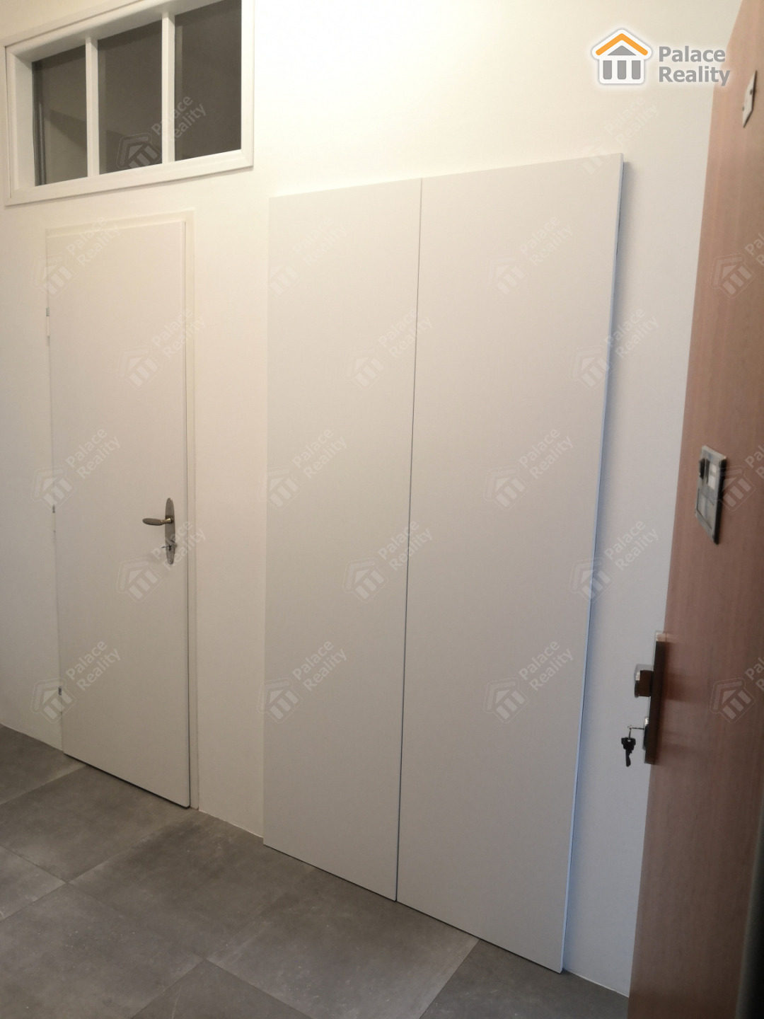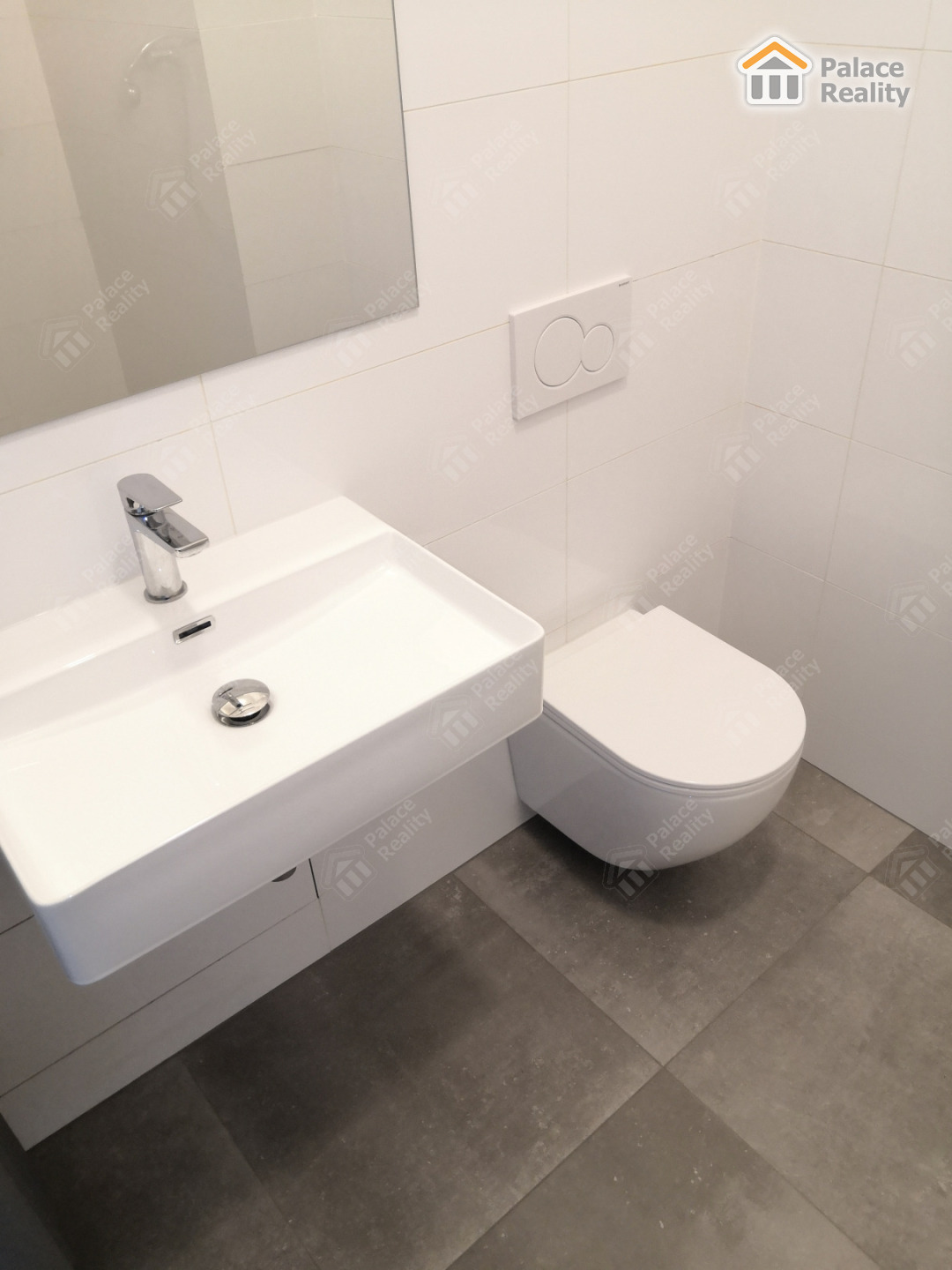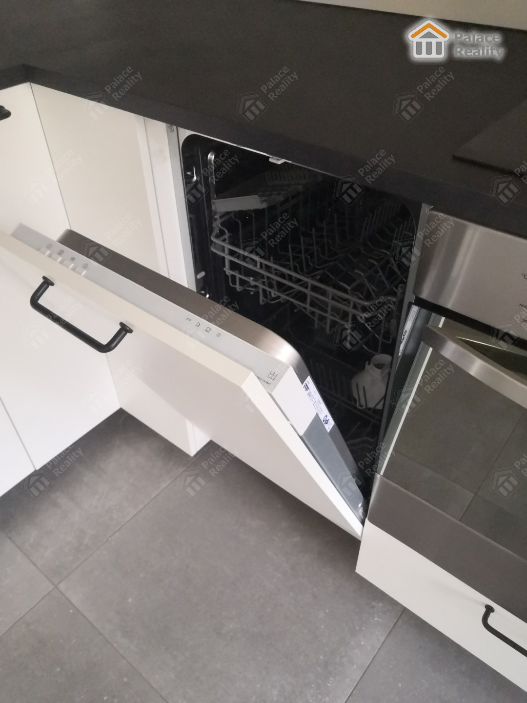Dispozice: prostorná předsíň, plně vybavená kuchyně včetně spotřebičů (elektrická indukční varná deska, el. pečící trouba, odsavač par, myčka nádobí, lednice) se vstupem na balkon, obytná místnost, koupelna s walk-in sprchovým koutem a WC, technický prostor s automatickou pračkou a sušičkou prádla.