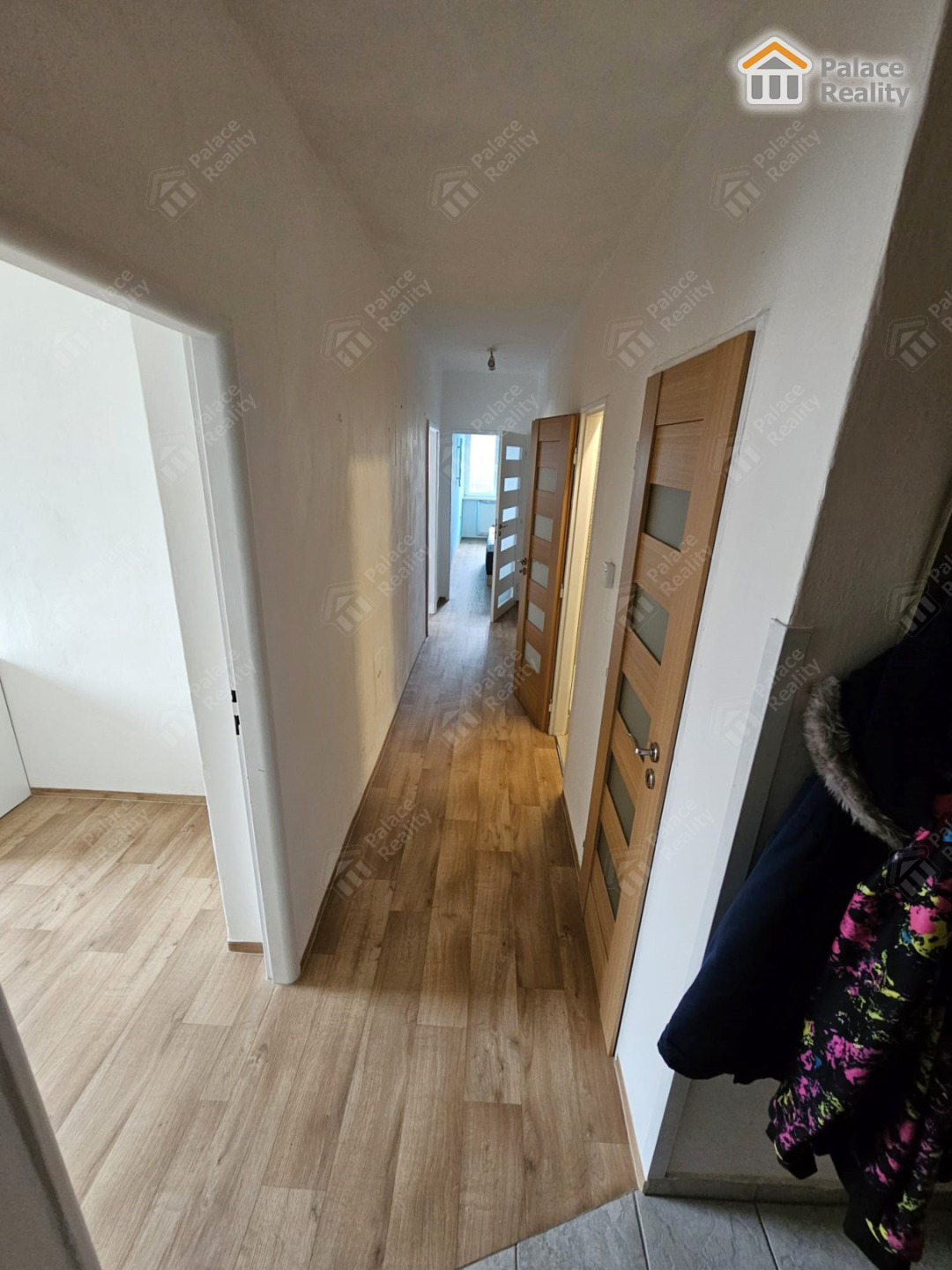 Dispozice: vstup, předsíň s odkládacím prostorem, prostorný obývací pokoj s jídelnou a vybaveným kuchyňským koutem včetně elektrospotřebičů, lodžie, 2 samostatné ložnice, koupelna se sprchovým koutem, WC, technická místnost. K bytu náleží sklepní kóje a komora mimo byt. Vytápění ústřední plynové, ohřev vody elektrickým bojlerem.