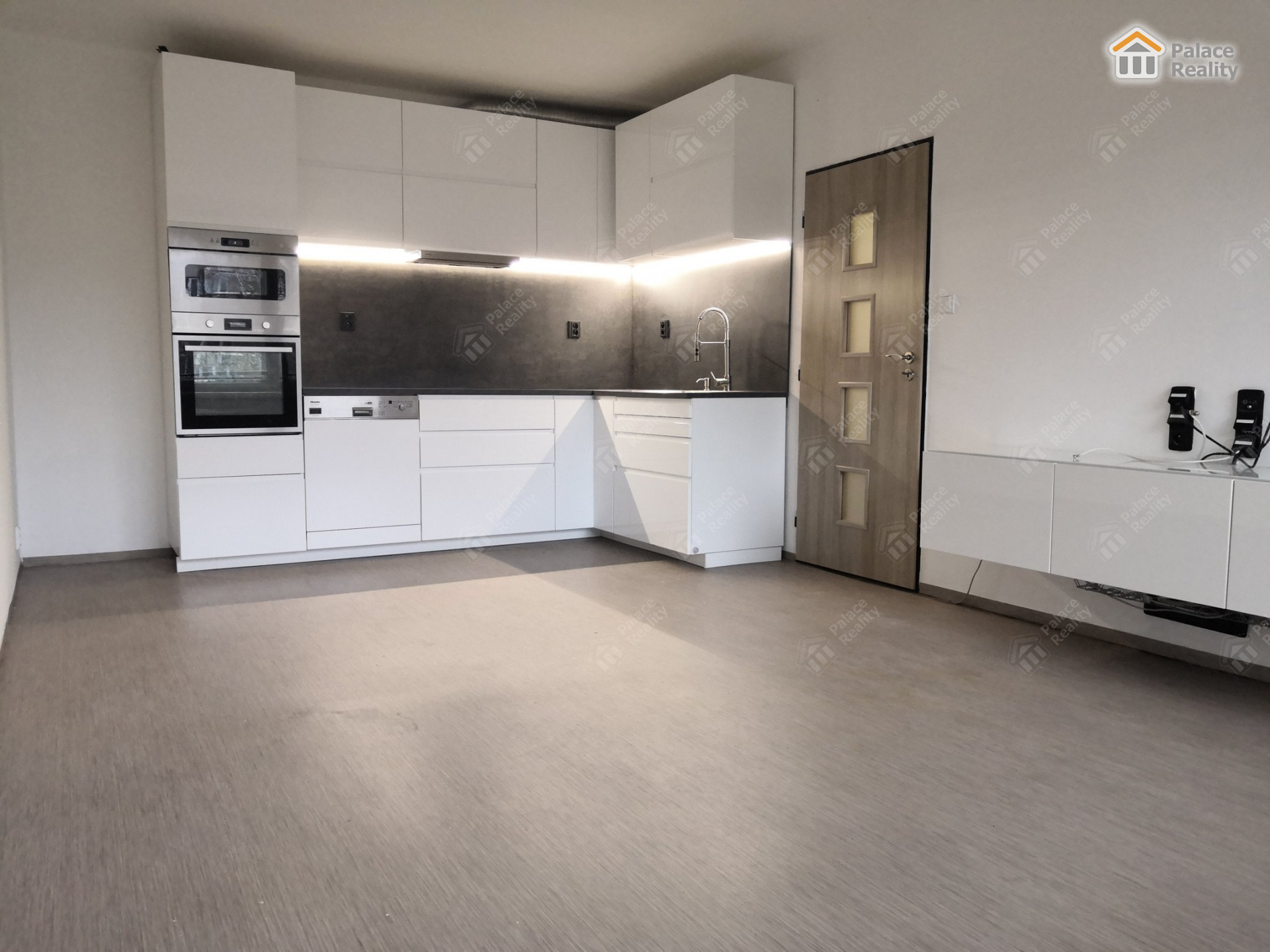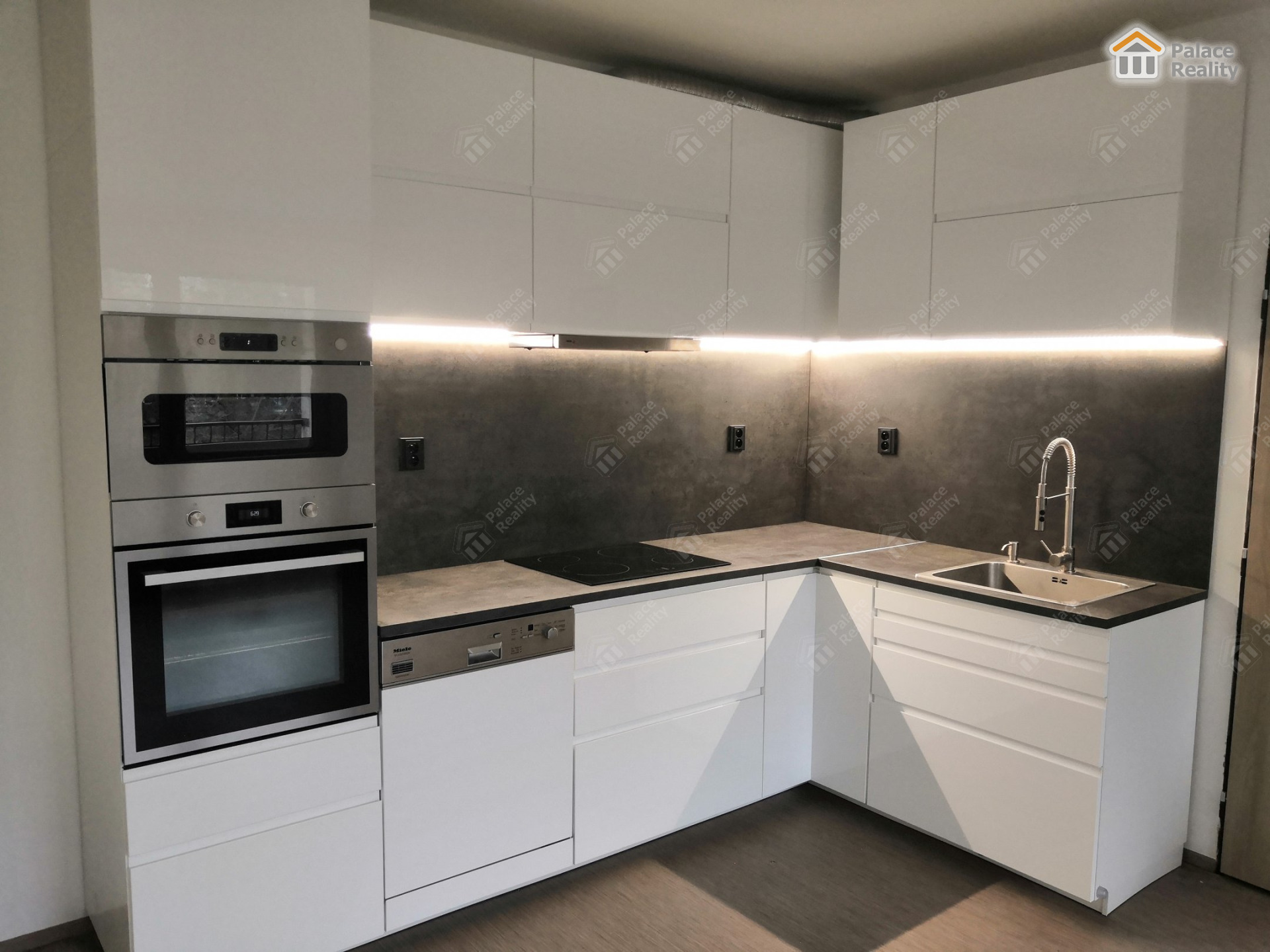 K dispozici kuchyňská linka včetně vestavěných spotřebičů (indukční varná deska, el. pečící trouba, mikrovlnná trouba, myčka nádobí).